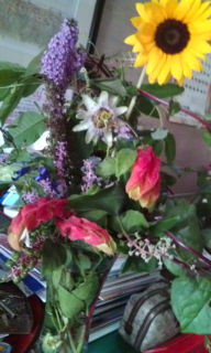 何時までも厳しい暑さが続いている お稽古事に出かけるにも 汗だく、 帰りに別教室の方から色々な今の花々を頂いた 自転車のカゴの中で 萎れていたが水に活けて間もなく花の顔(^o^)をもたげて 元気を取り戻した、笑顔を向けられた気持ちになる。