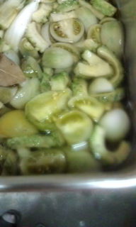 Rちゃんから届いた 色んな野菜たちは 一部 ピクルスに加工中です。青いトマトだの ゴーヤだの…。