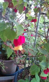 奥側に置いたスグリが実になりかけているけど まだ先の楽しみ、色が寂しいので 赤とクリーム色のサフィーニアを寄せ植えして吊した。咲き始めたら このブログも少しは艶やかさをアップ出来るかな…。