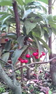 狭いベランダのブルーベリーの鉢の中でこの時期なぜか赤い実、よくみると なんと小ぶりな 万両の実が…、植えた覚えは無いけれど、かわいい☆ 植木や植物のエネルギーに 感激です。今年は 昇る龍になりましょうぜ!。(^-^)v