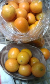 手前 金柑、奥 トマト、 今日の収穫は手前にある小さな冬のトマトです。赤くなる前に冬になってしまったのです。 ささやかな 秋の名残の収穫です。