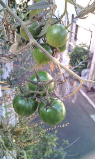 収穫間近のオリーブの実とまだまだ頑張って実を点け続けているトマトです。 涼しくなってからのトマトは甘味を増して赤くなるとそのまま口にいれてしまいます。 自分たちにも呉れるのではないかと周りでうろうろアピールを試みるのだワンU^エ^U。