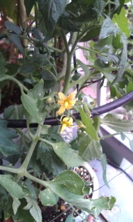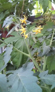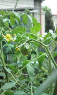 花だけで終わるかと思っていたトマトに小さな実が点いている、 よく見ると7つ8つとかわいい青い実が……いつの間になんども数を数えている。