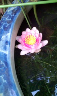 メダカ鉢の中で今年一つ目の睡蓮が咲いた、