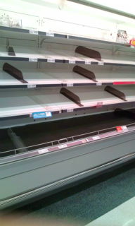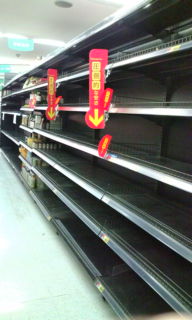 こんなときでも食事は大事、買い物に出て傍の西友に。二階の即席ラーメンの棚やらは空っぽ、入荷がままならない結果らしい… 。 みんな手軽な食料を確保しようとしている心理的不安のなせる結果だろうか、 我が家は相変わらず明日の朝ご飯のおかずを買っている、全く普段と変わらない、
