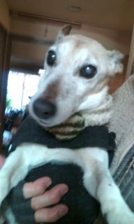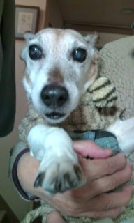 ちゃちゃU^エ^U はこれから散歩に行くところ、階段は降りられないので 抱いてもらって ゆっくりと歩き?ます。斜め歩きだけど……よく食べよく寝て