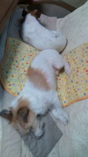 暑い中、手芸教室から帰ると犬たちは意外に元気、と思いきや彼ら涼しい場所を知っているのだ…、しっかりと場所取りをしている。涼しげな顔U^エ^Uである。