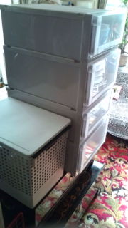 今年になってから溜まった不要品の整理をしていこうと決め、整理ボックスなど買い込んではみたものの片付けが遅々として進まない、いらないものを出す気力もない、暑さのせいにしてさぼり続けているのですが…なんとこの出しっぱなしの収納ボックスやスチールの棚が狭い我が家の一番の圧迫感となって、ことさら暑苦しい、暫くは見てみぬふりを決め付けて暑い中、今日もウダーっと過ごしてしまっている訳でして…。笑ってごまかせ自分の不精、、、(^o^)。