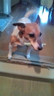 私が出かけるときはお留守番犬におやつをあげます、食べてる間にさっさと家を出てしまわないと追加のおやつを請求されるから、、 ん? 目が合ってしまった、ヤバ、急げ U^エ^U (^o^)