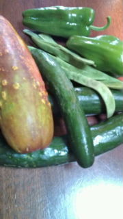 自家製無農薬ナチュラル野菜いろいろ楽しい贈り物が届いた、デカキュウリは懐かしい田舎の夏の味覚、 そして阿佐ヶ谷のベランダ菜園のブルーベリーの収穫もまだ続いている。