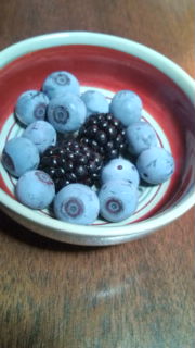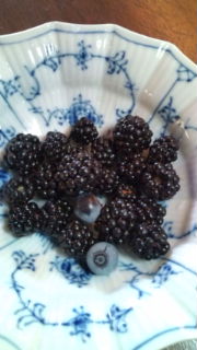 ブラックベリーの収穫、今年は甘味、酸味ともバランスのとれたおいしい実になった(^o^)。ブルーベリーも1つ2つ熟した実をつまんでみた、こちらもいい具合に育っている。