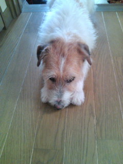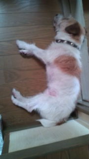 冷え冷えと床(壁)を踏まえて昼寝かな、、、なんて、冷風のたまる場所が解ってます。床が体温で温まると微妙に移動します。あーぁ夏はしんどい……。
