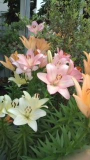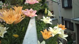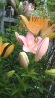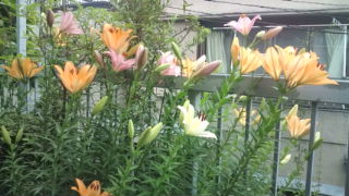 鬱陶しい梅雨空の下プランター二つの百合畑、どんよりの中の艶やかな色が気持ちを明るくしてくれる。
