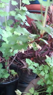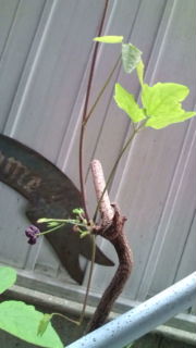 いただいたアケビのツルから新芽が出てきて小さな花が咲いている、派手さはないけどきれいな紫の花、鉄のパイプに絡んでしっかりと育ちはじめました。