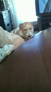 朝ご飯のあと飼い主とうさんの膝に手をかけてうとうとしているチョビです。
