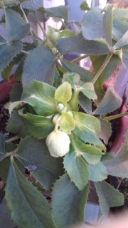 寒い朝でした、雪の消えたベランダで鉢のクリスマスローズが咲き始めている。葉の色と同じグリーンの花で目立たないけど地味ながらホッとする暖かさを感じる。今年も花を咲かせた