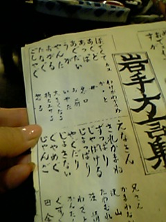 蕎麦を食べたいと思い入ったお店でメニューの裏にあった岩手方言集を見ていたら目の前の席で三人の若者達のわんこそばが始まった。私達が店を出る時一人90はい以上たいらげまだまだいけそうな顔だった、頑張ってるな、若者達、エールを贈って帰る、あれ?私達何を食べたっけ・・・。