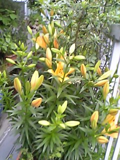 プランター百合畑の百合が咲き始めたけれど開いた花はオールオレンジ色、しかも花びらが大きい、球根をくれた千葉の姉に聞いたら色に依って開花が微妙に違うらしい、好きな白やらピンクやらがこのオレンジ色の勢いに負けないで咲いてほしい)^o^(