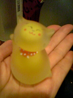 飼い猫が一匹増えましたー。お客様が猫の置物が一個だけで可哀相なので仲間のいる所に置いてあげたいともってきて下さった。これがまたカワイイ磨りガラス製、愛嬌のあるこのこもよろしくーー。