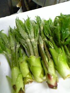 山菜です。まだ小さいのですが出初めの山の幸、天ぷらにします。山菜の天ぷらはこのほかにこごみ、たらの芽、やまうど、蕗の薹、タケノコ等の盛合せです。 この時期ならではの旬の味をお楽しみ下さい。