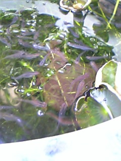 二つのメダカ鉢は満員状態、鉢の掃除をしながらこれ以上ふえた時の心配をしている。