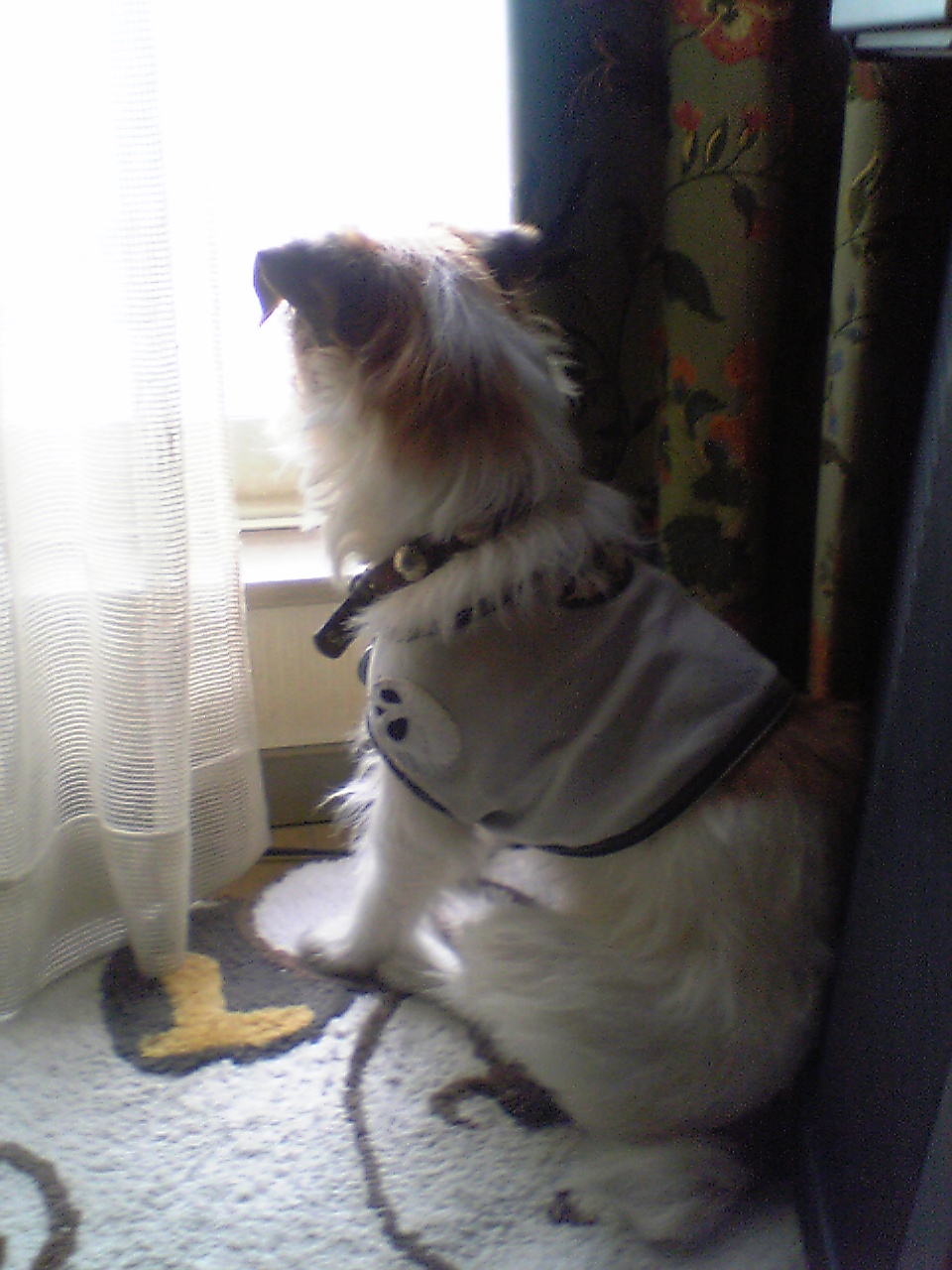 ベランダは猫達の通路になっておりノラネコのパンの子供達(パン子とよんでる)が通る度に反応している。さっきパン子が通った時に気付くのが遅れてしまった、気が納まらないようで、監視体制で待ち構えているチョビであります。・・・やがて自分がなんのために此処に居るのか忘れてしまったようでハウスへと去って行った。犬って面白いー(尾も白い)。