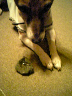 ちゃちゃのコレクションは石ころ、散歩の途中くわえて帰る。今日のは今までのなかでもかなり大きなものだ、下の前歯を3本も抜いた後なのにしっかりと持ち帰るなんてこの石ころ集めはいつまで続くことやら・・・・。
