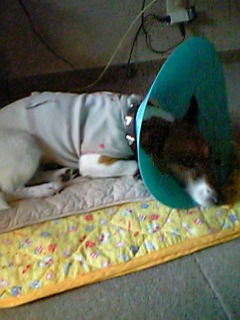 夜になってちゃちゃの面会に行ってきました。麻酔がきれない状態でも解るようで「頑張ったね、偉いね」と声かけたら尻尾を振りながら立ち上がって抱きついて来ようとしたけどふらふらとして倒れてしまう。明日また来るからゆっくり休みなさい・・・ね。後ろ髪をひかれる思いで帰って参りました。