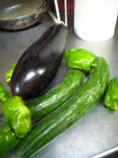 食料自給率が低い我が国にあってこれから先を悲観してしまうより、「楽しんで菜園を作っている人達が無農薬野菜くださいました。少しおすそ分け、」と、ヒロクンが撮影に姫路にいった帰りに届けてくれました。おーっきな茄子や胡瓜や・・ありがとう私もいつか近いうちに畑作って釣りをして近所の農家からミルクや卵を仕入れて・・・なーんて憧れてます。