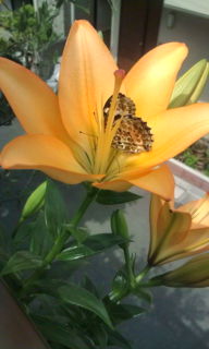 ベランダのユリに 蝶々がきて暫くして飛んで行きました。 戴いた花がキレイだから ユリに留まって見て行ったのでしょう……