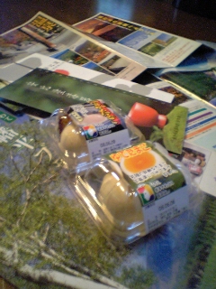昨日の日曜日家人が田舎の集まりで(ふるさと会)という名目で東京近郊で暮らしている人達とふるさとにいる人達とで親睦を深めかつ自分の出身地の今を知る…とか、…な、主旨で毎年行われている会に出席してお土産を携えて帰ってきた。たくさんのパンフとゆで卵、温泉卵の詰め合わせ一箱、一個づつパックされていて味もいい!これって結構便利だしきれいにいただけますー今回のヒット商品でした。