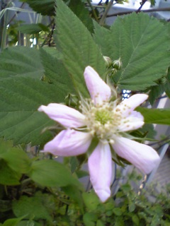 朝、蕾だったブラックベリーの花がさっき気がついたら一輪だけひらいています。淡いピンク色なのに