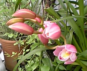 えん家のお休みも今日まで、 片付け物などして過ご しています。緑色のベランダに色を添えるようにピンクのランが咲き出しました。