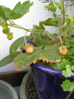 我が家の物干し、兼菜園の 小さなベランダに並んだ 鉢植えの一つ、ワイルド ストロベリーが今年も