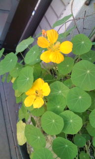 ベランダの鉢植え、花が終わって大豆のような種をその鉢に追肥して植えたら 早々と花がついた、冬だというのに…。異常な天気に 騙されたかな?