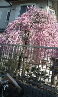 Iさんに 誘われて ちょっと 遠回りして 素敵なお宅の家の庭前の道に立ち止まり 写メ…無断でパチリ、、、。 見事な八重の枝垂れ梅の花、、、。 周りもアカシアの花や終わりかけた ろう梅やら 蕾の膨らみかけた 木蓮など 楽しい季節になってきました。