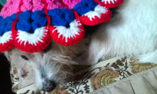 先日 ふるさとの知人から手作りのクッションを頂きました、一つはお店に 一つはW子に あとの4つは家の椅子に並べました。 早速寄ってきた チョビ犬は 被る物と思っているらし……~潜り込んで ZZZ、、、。