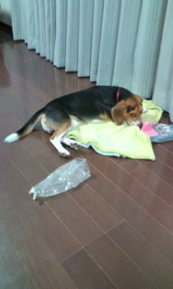 W子んちの ポンズ(ビーグル犬)初対面です。 なかなか面白いコです。 構えが 座ってる、と思いきや 飲みながら食事しているうちに二足のスリッパが 犠牲になりました。 まだまだイタズラ盛りです。 うちの茶々犬チョビ犬はそんな事しません、、というより出来ません… 歯がない、、、