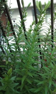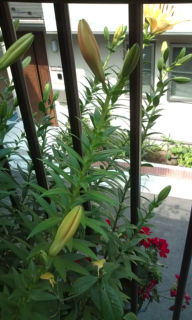 去年は ブルーベリーも寿命だったのか 全滅していた、そこで 今年は 新しい苗を植えました。 また新しい実がつくのを期待して…。その鉢の前でやや寿命に近いユリの花が今年も咲き始めました。 ガンバレ!花たち。 そしてガンバレ ご同輩。 (^-^)